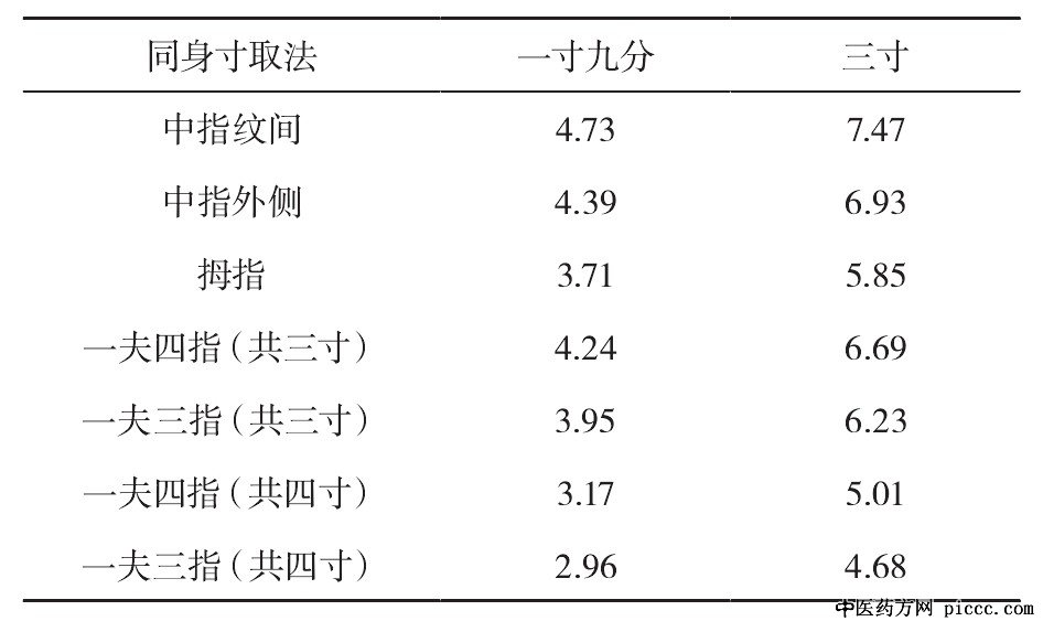 同身寸,《黄帝内经》《针灸甲乙经》尚无此说法,隋唐时才有,但“一夫”的概念早在东晋就已存在。《黄帝内经》《针灸甲乙经》虽无同身寸之名,但《说文解字》中已有“布指知寸”之说。李锄在《骨度研究》中记载了同身寸的多种量取方法[15],结合赵鸿鸣等[16]实测1 005例成人的不同同身寸得出的平均值:中指纹间2.49cm、中指外侧2.31cm、拇指1.95cm、一夫四指6.69cm、一夫三指6.23cm。可测算寸关尺长度如表2。