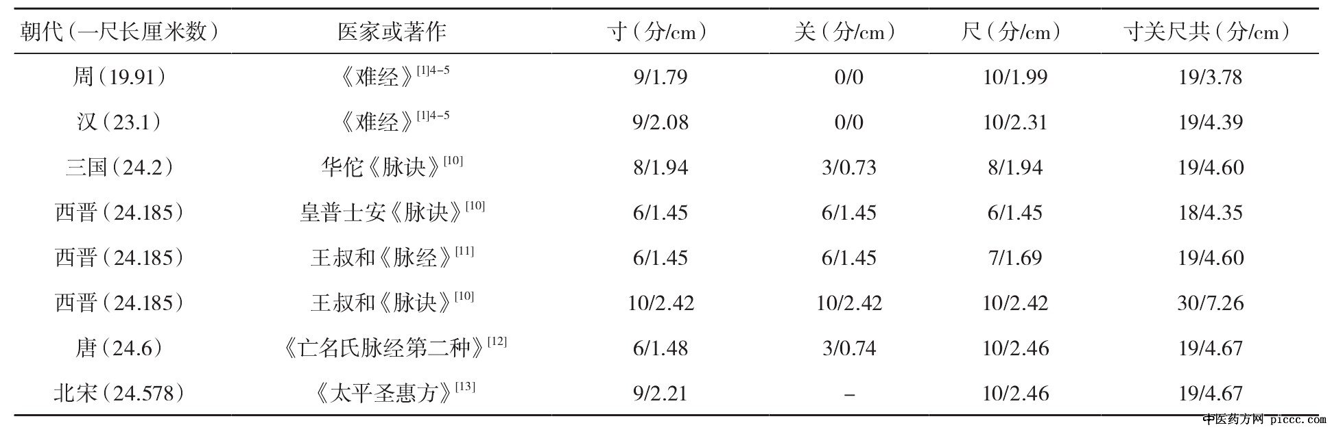 《汉书·律历志》云:“度者,分寸尺丈引也,所以度长短也……十分为寸,十寸为尺,十尺为丈”。因进位合理、使用简单、量值适中。几千年来,历经改朝换代,尽管一尺之长有所增损,而单位制却延续下来[14]。依据《计量史》厘定的各个朝代一尺的长度,换算出了各朝代医家所言寸关尺各自的长度和总长度。其中《难经》的说法有的医家认为是按照周代尺的长度,表1中也做了折算。