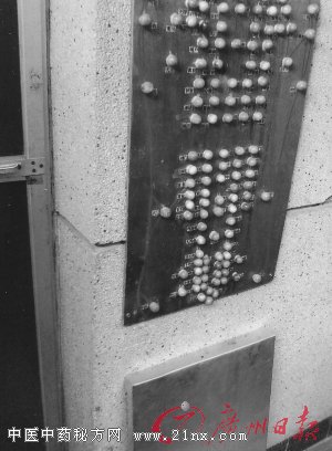 5 撞背器 为提高撞背的效果,做了一块穴位撞背器(图⑥)。取一块背部大小的五夹板,按背部穴位贴上一厘米大的木珠,按背部高度固定在阳台墙上,配一个铝片盖即成。撞背时取下铝片盖,背部正对穴位撞背器,离墙约20厘米站立,初次撞背要轻,以免损伤。头向前倾撞腰部,每回各撞100次,刺激腰背穴位,有轻微酸痛感,消除腰背疲劳与酸痛,常撞背防病养生,撞腰背部相关穴位,有治病效果,我经常感冒不再犯了。