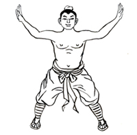 左右打开,至水平位握拳。依次放松肩、肘、腕、手指的同时慢慢起身。重复导引七次后,恢复松静站立。