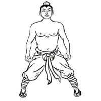 两脚开立,略宽于肩,屈膝下蹲成大马步.