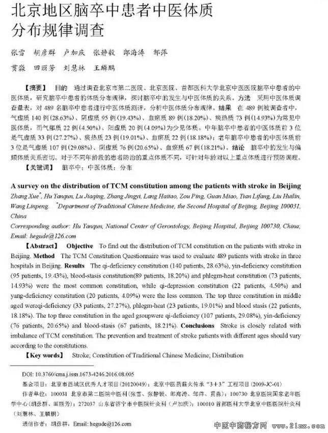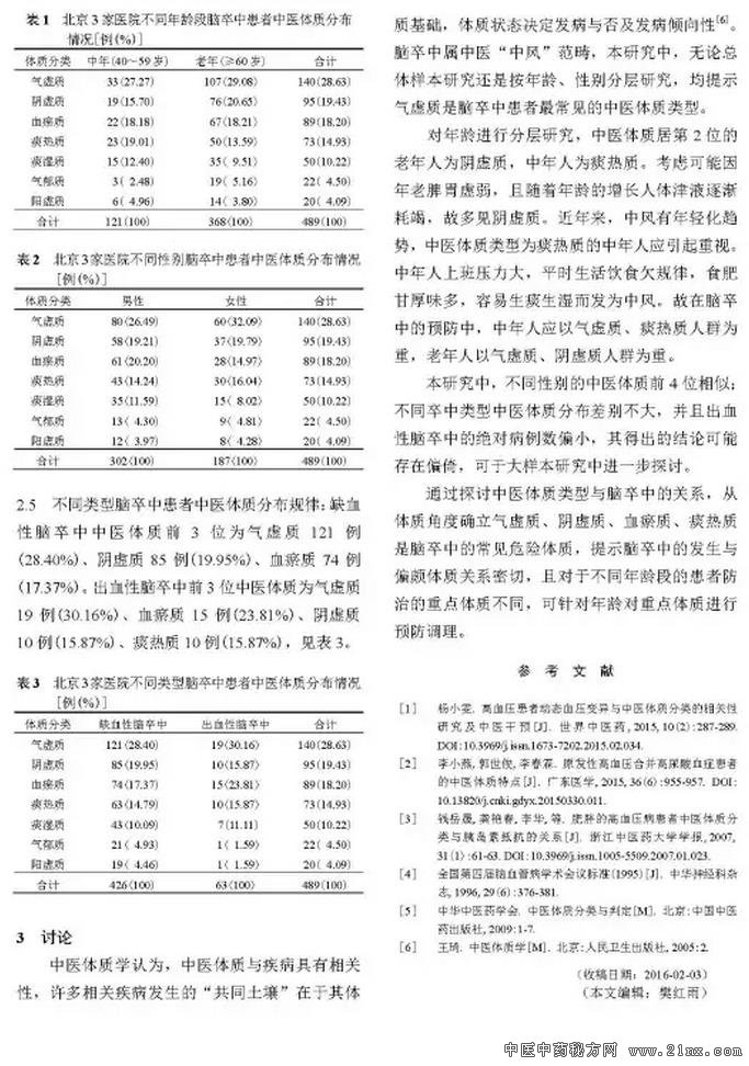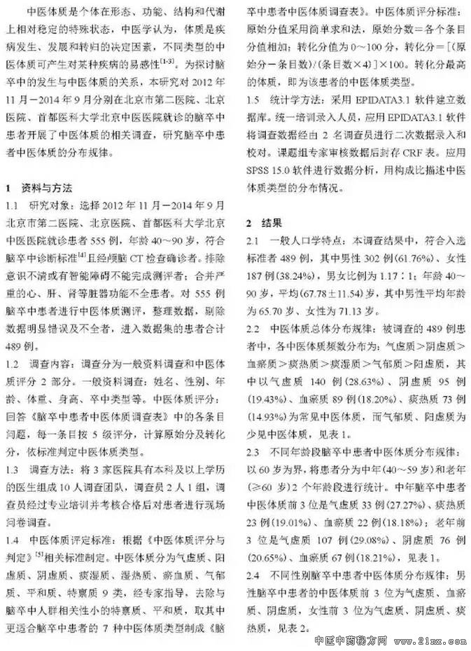 中医体质是个体在形态、功能、结构和代谢上相对稳定的特殊状态。中医学认为,体质是疾病发生、发展和转归的决定因素,不同类型的中医体质可产生对某种疾病的易感性。为探讨脑卒中的发生与中医体质的关系,本研究对2012年11月-2014年9月分别在北京市第二医院、北京医院、首都医科大学北京中医医院就诊的脑卒中患者开展了中医体质的相关调查,探讨脑卒中患者中医体质的分布规律。![]() ![]() ![]() |
