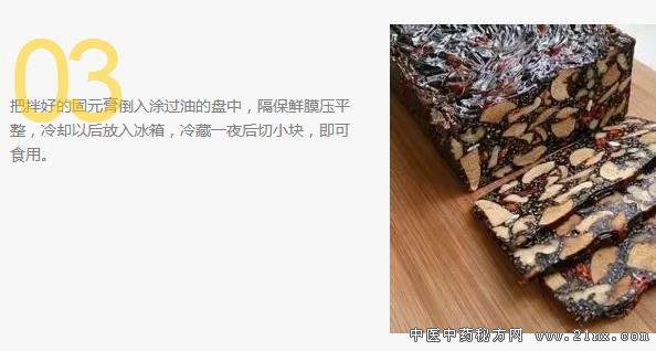 “固元膏,也叫阿胶糕,据传是慈禧晚年非常喜欢的一道药膳;也有说此方是由唐代杨贵妃所创,常食可以养血润肤,头发乌黑,人称贵妃美容膏。”