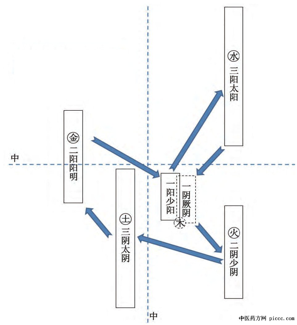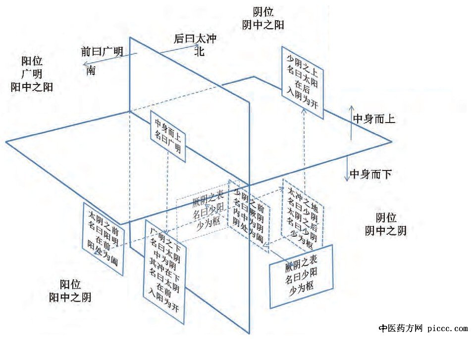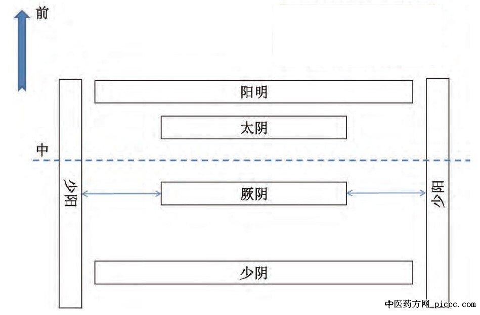 注:除少阳外, 其他皆可在矢状面描述, 少阳在厥阴之表。