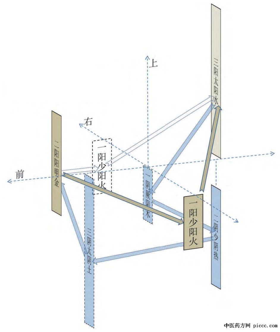最大的奥妙在于, 如此推演而出的六气相贯, 竟恰恰合于五运六气的生化之道。《素问·六微旨大论第六十八》讲:“少阳之上, 火气治之;阳明之上, 燥气治之;太阳之上, 寒气治之;厥阴之上, 风气治之;少阴之上, 热气治之;太阴之上, 湿气治之”。天行六气与地运五行, 有一气不能配属为对, 正是少阳, 而如果将太阴→阳明→少阳→太阳→厥阴→少阴→太阴的气化之环中的少阳“取出”, 则成为土→金→水→木→火→土, 正是五行相生之环。而又恰恰只是少阳, 在躯干两侧, 如果“取出”少阳, 六气运行之环成为平面, 加入少阳, 成为立体。可参看图1, 图4。