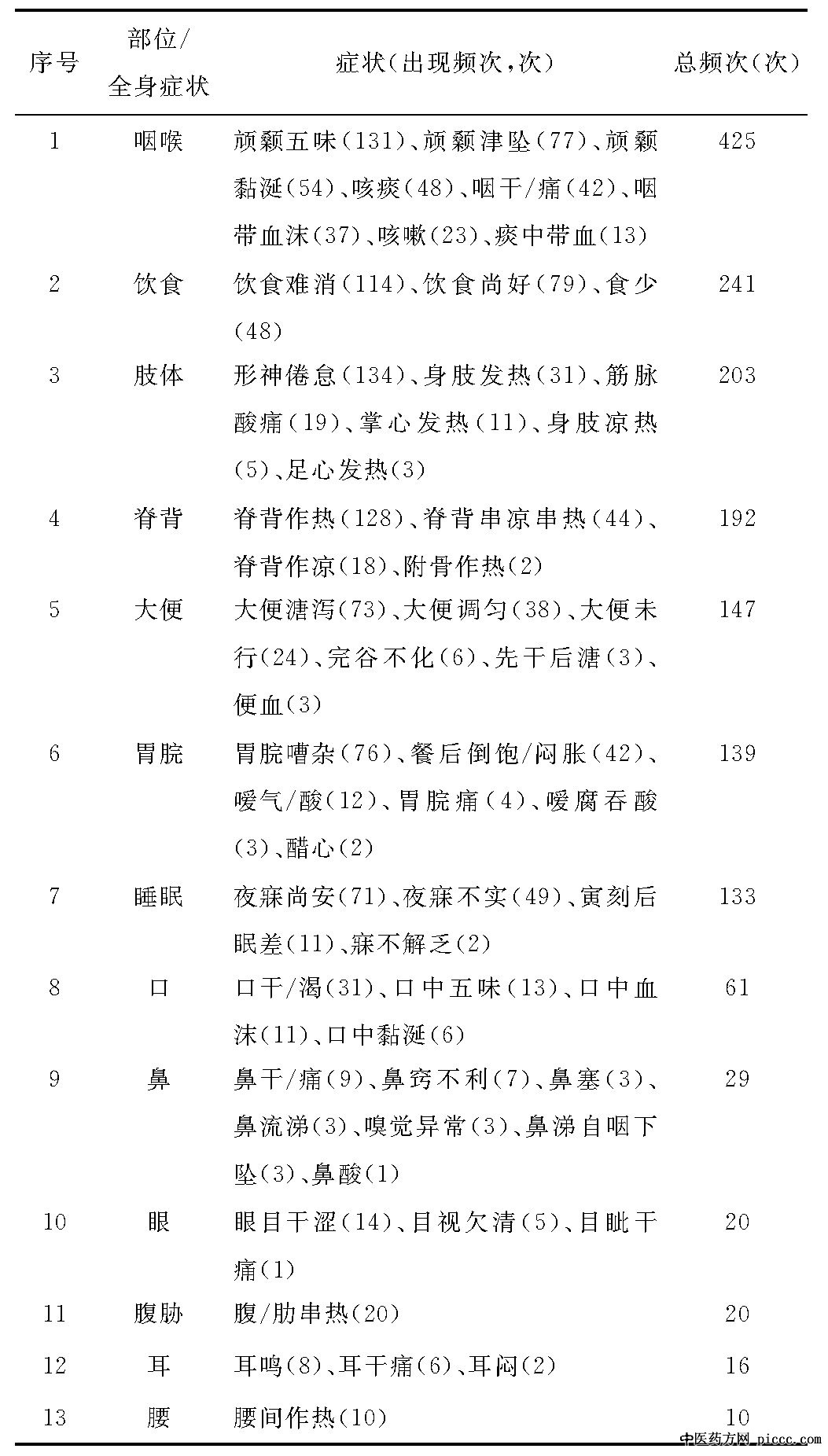 纵观光绪六年的慈禧病案,发病部位较多,包括眼、耳、鼻、口、咽喉、胃脘、腹胁、脊背、腰及肢体均有不同程度的不适,此外饮食、睡眠、二便也不甚佳。尤以咽喉部(425次)、脊背部(192次)、胃脘部(139次)、五官(眼部20次、鼻部29次、口部61次、耳部16次)、肢体(203次)、饮食(241次)、大便(147次)、睡眠(133次)等症状多见。见表1。