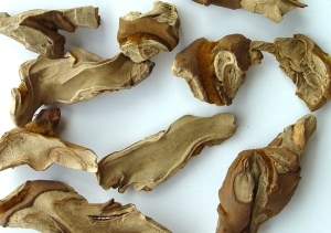 【来源】 为蚌壳蕨科植物金毛狗的根茎。秋末冬初地上部分枯萎时采挖,除去泥砂,晒干,或削去细根、叶柄及黄色柔毛后,切片晒干者为生狗脊;如经蒸煮后,晒至六、七成干时,再切片晒干者为熟狗脊。广西、浙江等地加工时每100斤狗脊加入3~5斤黑豆皮,煮至颜色变黑后,捞出晒干。