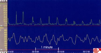 图4.8 同时行餐后EGG和胃窦测压,EGG显示每分钟3次的规则