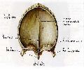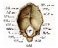 后部中央可见到枕骨大孔及其两侧的枕骨髁,枕骨髁后方有不恒定的髁孔,前方有舌下神经管外口。枕骨大孔前方正中有咽结节,两侧有颈静脉孔和颈静脉窝。颈静脉窝的前方有颈动脉管外口,再向内侧可见破裂孔,颈静脉窝的前外侧生有茎突,其后茎乳孔,孔的后方为乳突。外耳道在茎突前外侧,其前方有下颌窝和下颌结节,在枕骨大孔后方有枕外嵴、枕外隆凸及其两侧的上项线和与之平行的下项线。