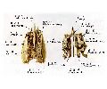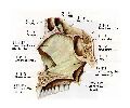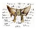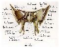 蝶骨位于颅底中央,形如蝴蝶,分体、小翼、大翼和翼突四个部分。体部位居中央,上面构成颅中窝的中央部,呈马鞍状叫蝶鞍,中央凹陷叫垂体窝;体部内有空腔叫蝶窦,向前开口于鼻腔。小翼从体部前上方向左右平伸,根部有视神经管,两视神经管内口之间有视交叉沟。大翼由体部平伸向两侧,可分三个面:脑面位于颅中窝,眶面朝向眶,颞面向外向下。大翼根部由前向后可见圆孔,卵圆孔和棘孔。体部两侧有颈动脉沟。在小翼和大翼之间有眶上裂。翼突位于蝶骨下面,由内侧板和外侧板构成,两板的后部之间有楔形深窝叫翼突窝,翼突根部有前后方向贯穿的翼管。