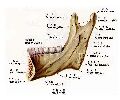 下颌骨mandible位于上颌骨下方,分体和支。体呈弓状,下缘光滑,上缘生有下牙槽。外面前方正中部向前的隆起叫颏隆凸,对第三颗牙槽下方处有颏孔。在体的内面中线处有尖锐的颏棘,其下方两侧有二腹肌窝,由窝的上缘一条斜线,叫下颌舌骨线,线的内上方和外下方各有一浅窝,上方为舌下腺窝,外下方为下颌下腺窝。下颌支末端分叉形成前方的冠突,后方的髁突,中间凹陷处叫下颌切迹,髁突上端膨大,叫下颌头,其下稍细,叫下颌颈,颈的前面有翼肌凹。在支的内面中央有下颌孔,经下颌管通向颏孔,在下颌孔前方有下颌小舌。支与体的接合部叫做下颌角,角的外面有咬肌粗隆,内面有翼肌粗隆。